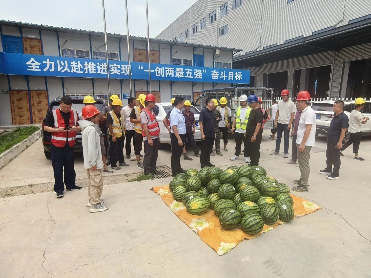 7月8日上午,市場(chǎng)投資公司副總經(jīng)理張航旗、總經(jīng)理助理胡占濤一行前往騰達(dá)項(xiàng)目施工現(xiàn)場(chǎng),慰問(wèn)酷暑作業(yè)中的一線(xiàn)工人并開(kāi)展項(xiàng)目查看工作,為他們送去西瓜等清涼物資,并就項(xiàng)目建設(shè)問(wèn)題進(jìn)行了交流。